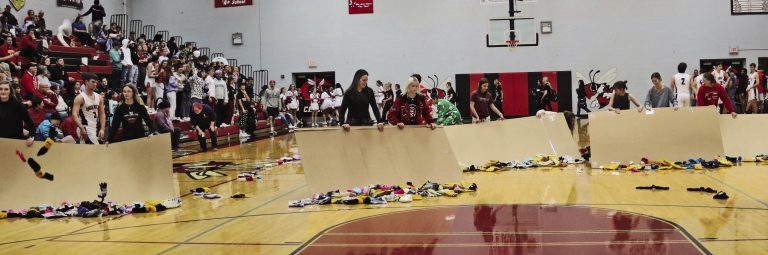 Members of the Chillicothe High School student council members use cardboard scrapers to push fan-donated winter gloves and other winter paraphernalia off the CHS gym floor after the Hornets’ first basket not quite 2-1/2 minutes into their home game against Trenton last Friday. The gloves donated will be provided to the Livingston County Health Department’s annual “mitten tree” project, which will share them with financially-strapped persons unable to provide them for themselves or loved ones. The gloves initiative replaces, at least for this year, the “teddy bear toss” stuffed animals collection the CHS Leadership Class had conducted for the past decade or so.